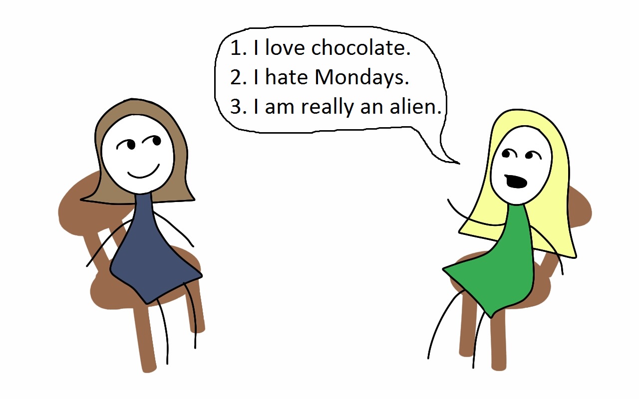 Instead we had to play mind games to get to know one another. In the most popular game you have to tell another person three things about yourself. Two of these things are true and one is a lie, and they have to guess which one is the lie.