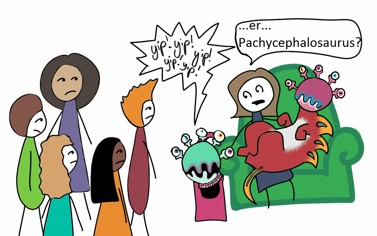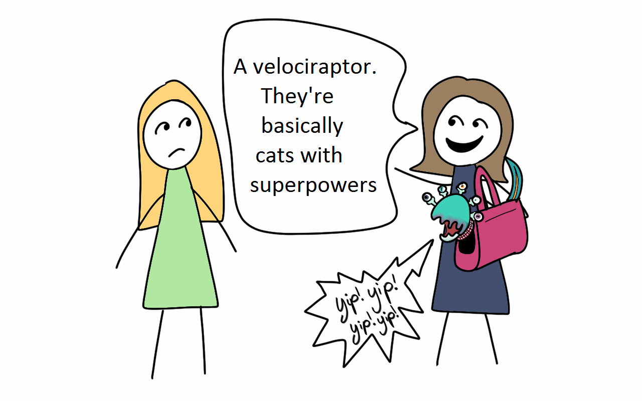 Which does at least stand up as a conceptual definition. I think using the word ‘foible’ (little crazy thing) makes the weakness or quirk out to be a cute little lap-dog monster. And sometimes they are. You could buy a rhinestone (cheap diamonds) collar for a-tendency-to-mention-dinosaurs and carry it around in a purse.