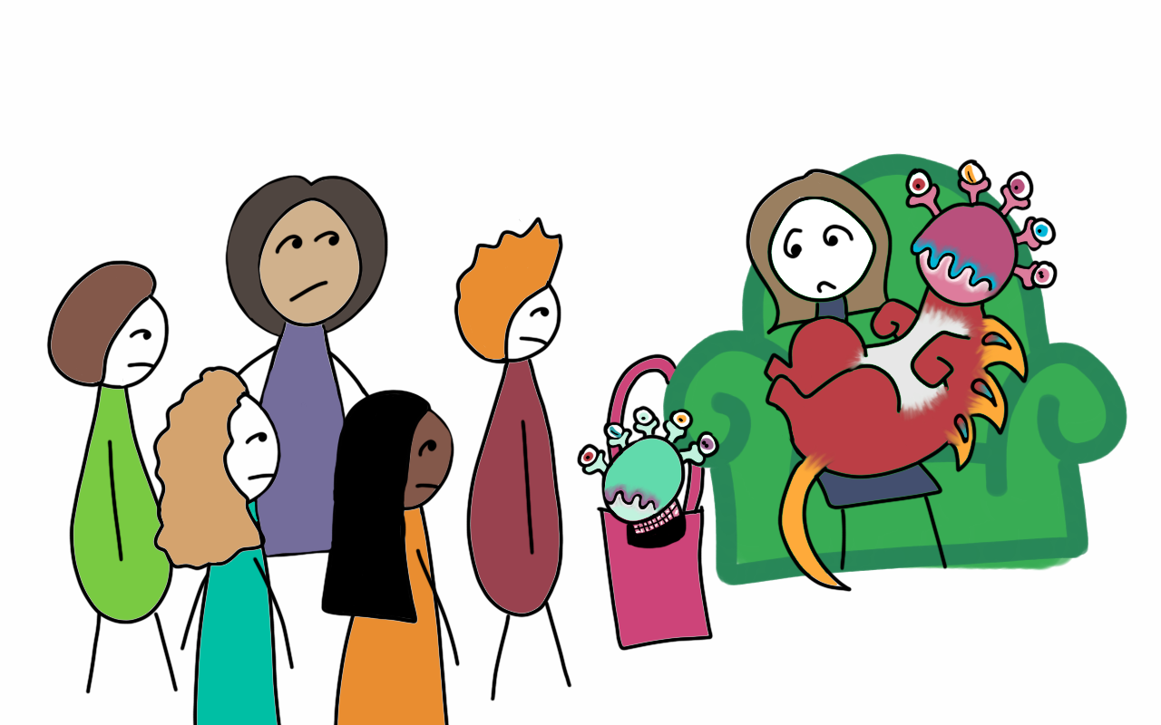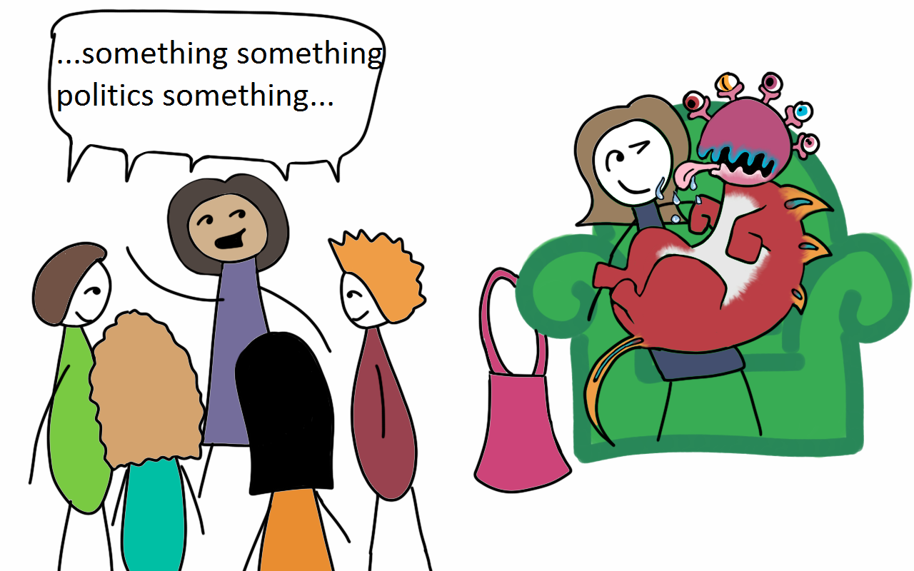 But, like dogs, foibles (little crazy things) aren’t all purse-sized. Some, like difficulty-talking-sensibly-in-front-of-groups-of-five-or-more-people, are more like those Great Danes with delusions of tininess who think they can, nay should, perch delicately in your lap.