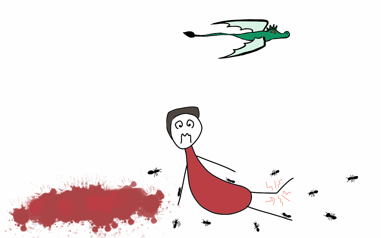 My partner loved what I wrote about his injury. He was delighted to find himself in a starring role in a blog-story and to have his ant-war cartoonised. But he quickly began to regret turning down my offer or re-writing the injury part with dragons. He didn’t make a big deal about it, but I could tell he felt he had missed his opportunity to be immortalised in a daring action-filled escapade.